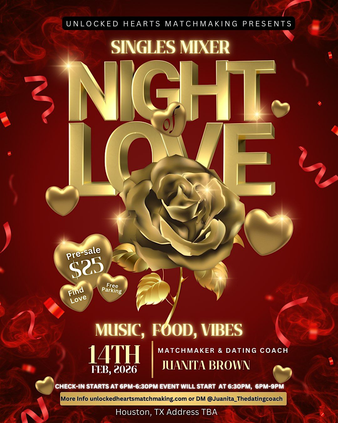 Come join us for our 3rd annual Night of Love Singles Mixer & Speed Dating event! This event is the perfect opportunity to meet intentional singles and potentially find your special someone! Join us on Saturday, February 14th, 2026 at 6:00 PM for an exciting evening filled with speed dating, fun activities, and the chance to connect with other singles in person. Check-in starts at 6:00pm and the event starts promptly at 6:30pm. You must arrive before 6:30pm. Experience an enchanting gathering ensuring an even balance of men and women for an unforgettable night of love.