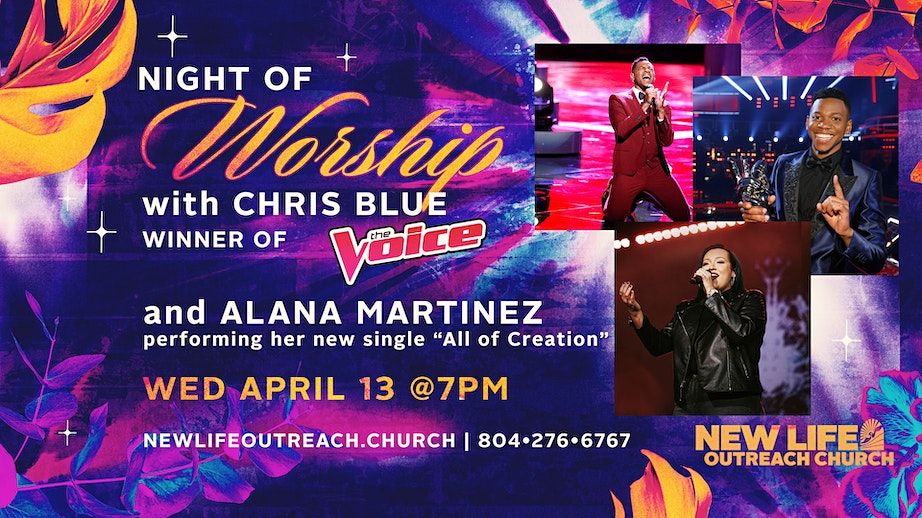 Join New Life Outreach Church for a very special night of worship featuring Chris Blue winner of the Voice. He is joining Alana Martinez and the New Life Choir. Alana will be performing her new single "All Of Creation".