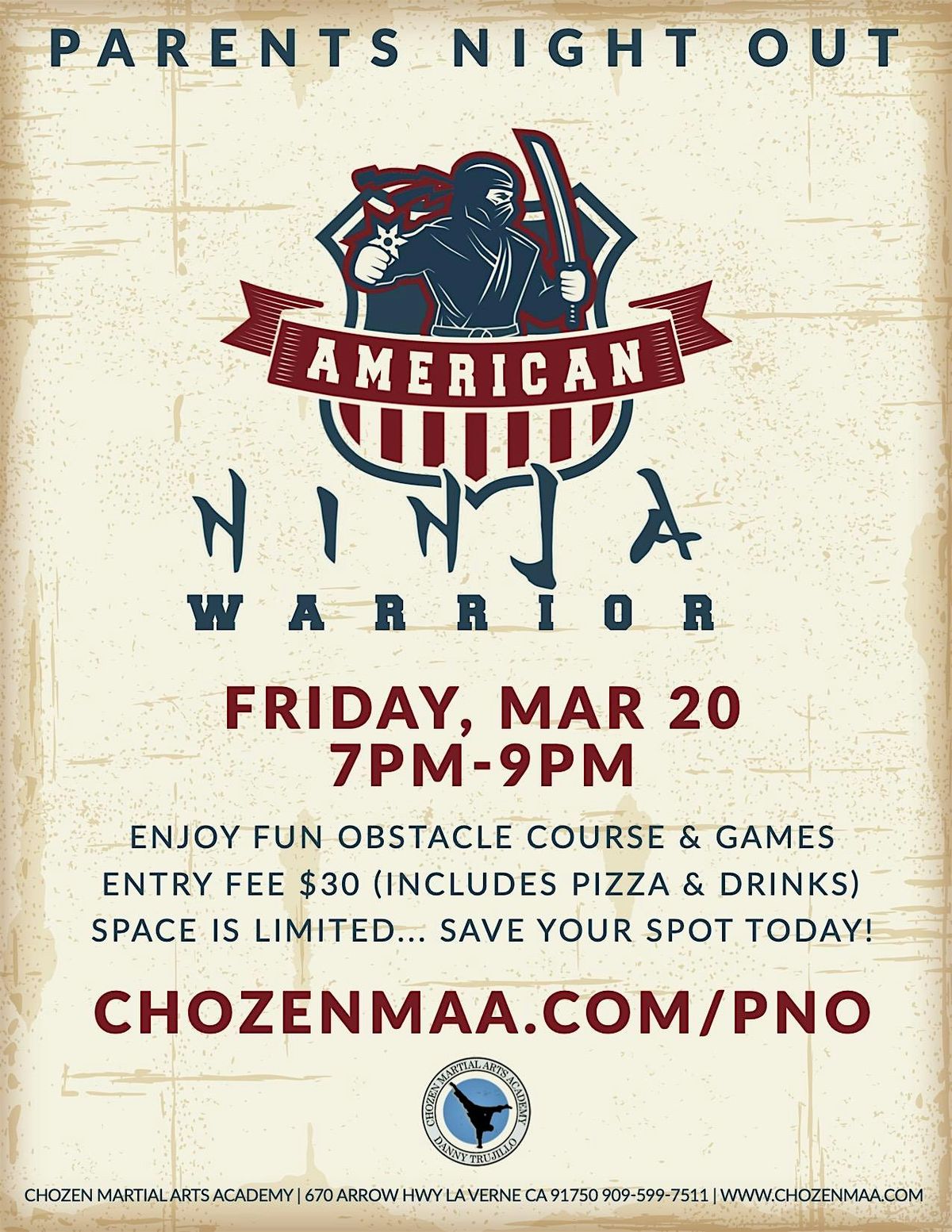 Need a couple of hours away from the kids? Drop them off at Chozen's Parents Night Out! We'll have fun and games to keep your child entertained. PLUS we're serving pizza and drinks!