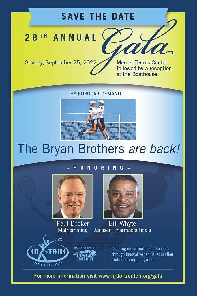 And there’s more! The World Champion Bryan Brothers, Bob and Mike, will return as our special guests, beginning with a Tennis Clinic and Exhibition. Get your ticket here for this amazing opportunity to see the Bryan Brothers first-hand and support NJTLT's mission of serving youth through innovative tennis, education, and mentoring programs.