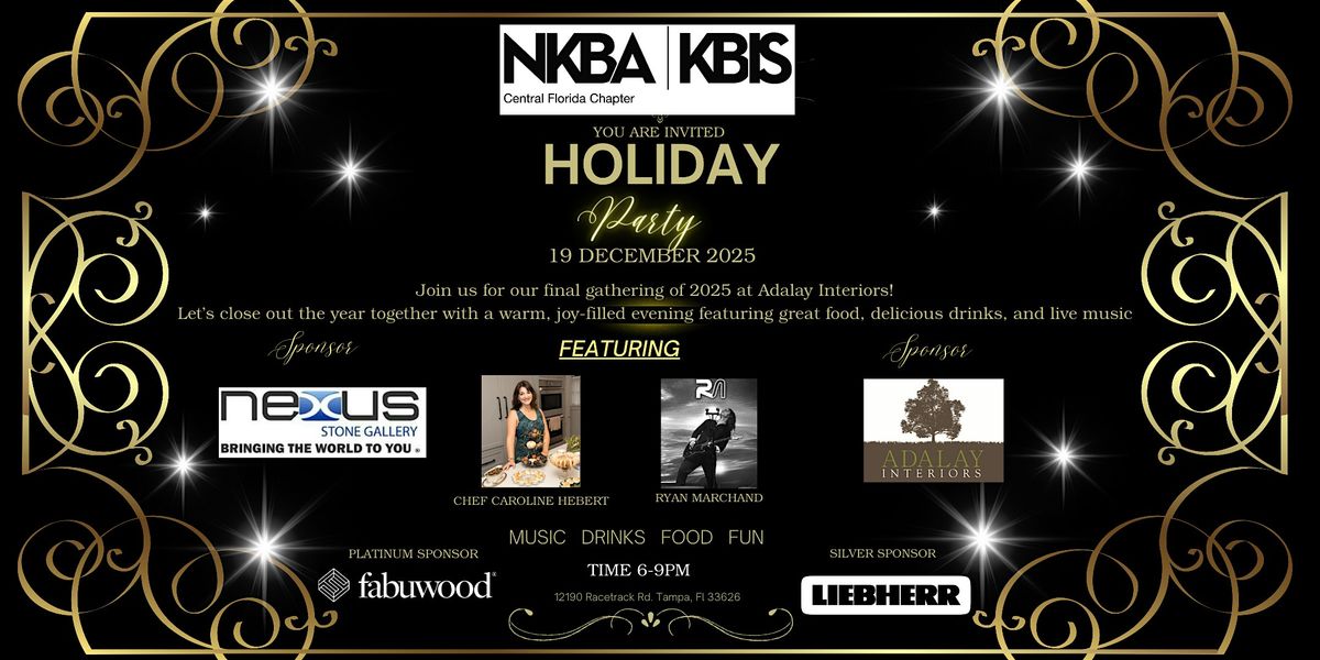 As we reflect on this year, we are truly thankful for the inspiring meetings, meaningful conversations, and incredible networking shared with our NKBA Central Florida members. Your energy, creativity, and commitment have made 2025 a remarkable year for our chapter. We warmly invite you to join us for our final gathering of the year—an unforgettable evening filled with fun, live music provided by Ryan Marchand, and a beautifully crafted dinner by Chef Caroline Hebert. We look forward to celebrating this wonderful community together one more time before the year comes to a close.