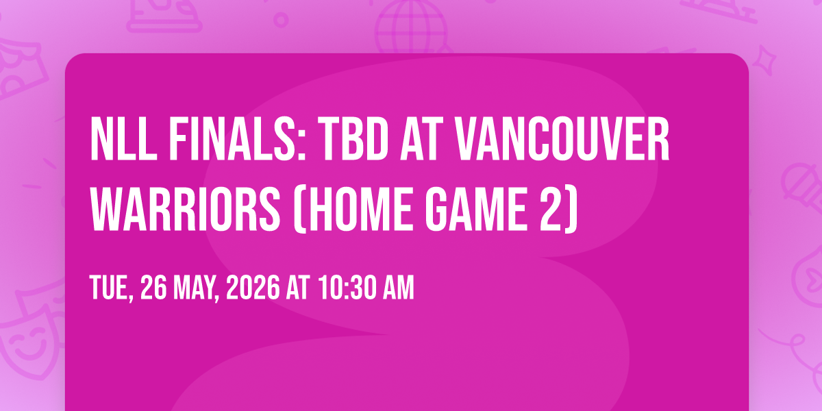 π Location: 49.2782, -123.108β¨ Discover the extraordinary at NLL Finals: TBD at Vancouver Warriors (Home Game 2), where magic meets reality in ways you've never imagined! ποΈ Set in Rogers Arena nestled in bustling Vancouver, BC, this event promises to be a landmark occasion. π Taking place on May 26th, 2026 at 10:30 AM, it's going to create an atmosphere where every moment becomes a cherished memory. π Immerse yourself in an experience crafted with attention to every detail, designed to surprise and delight at every turn. They have worked tirelessly to ensure this event exceeds all expectations, bringing together elements of entertainment, innovation, and pure joy. π Don't miss your chance to be part of this remarkable journey!