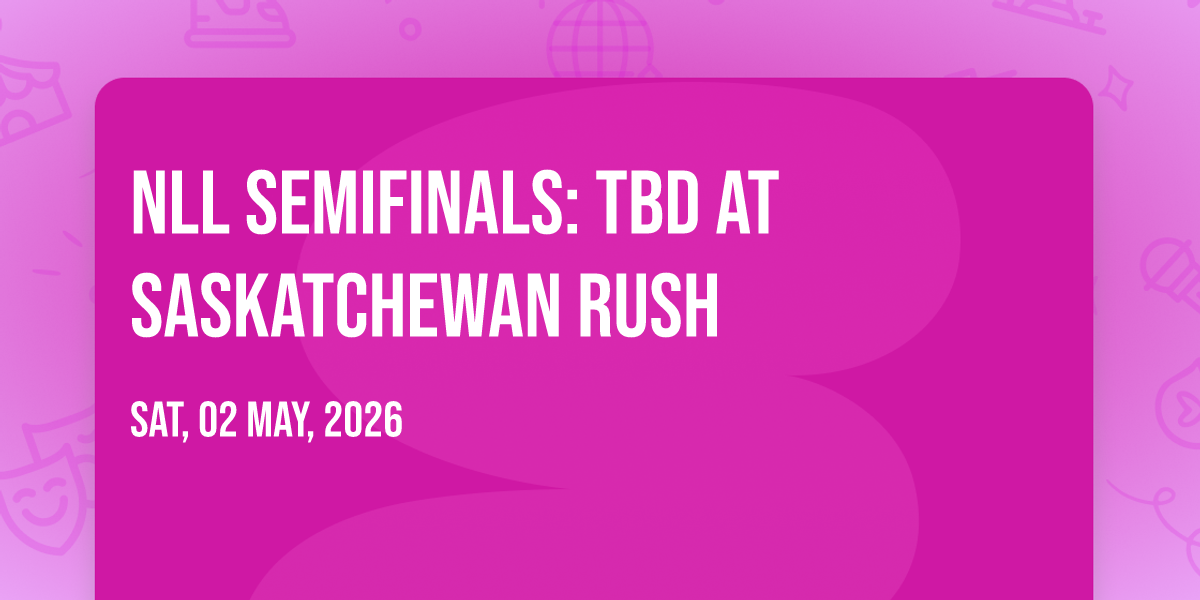 📍 Location: 52.1882, -106.676🎉 Prepare to be amazed at NLL Semifinals: TBD at Saskatchewan Rush, the most anticipated gathering of the season! 🌟 Set against the stunning backdrop of SaskTel Centre in vibrant Saskatoon, SK, this event promises to redefine your expectations. 📅 Mark your calendars for May 11th, 2026 at 09:30 AM and get ready to immerse yourself in an atmosphere of wonder and excitement. ✨ From the moment you arrive, you'll be transported into a world where memories are made and stories come alive. They have crafted an experience that perfectly harmonizes entertainment, innovation, and community spirit. 🌈 Join us as we create moments that will be discussed for years!