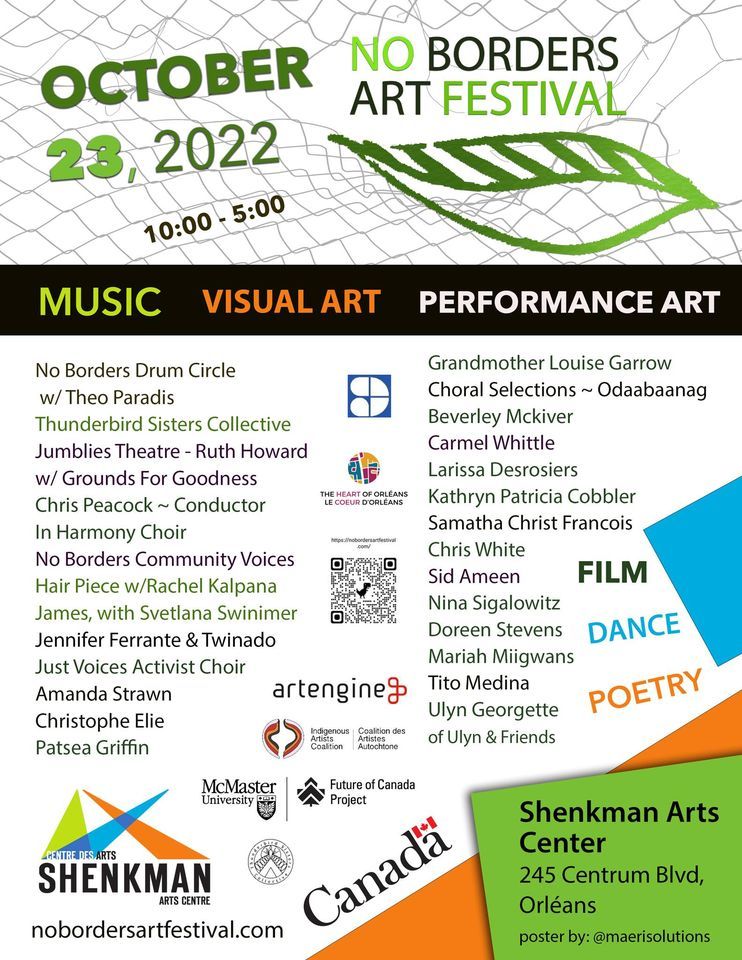 Each year the NBAF brings together people from all communities. This year will bring two collaborative community groups together, the No Borders Community Voices who will perform a series of songs composed by Indigneous composer, Beverley Mckiver. We will also be joined by the Toronto Jumblies Performance troupe, who will share film, panel discussion groups and No Borders will invite local artists, musicians to join in the festivities and share their experiences. There will be discussion groups and will be run both live and hybrid to be sure that No Borders Art festival remains accessible to all.