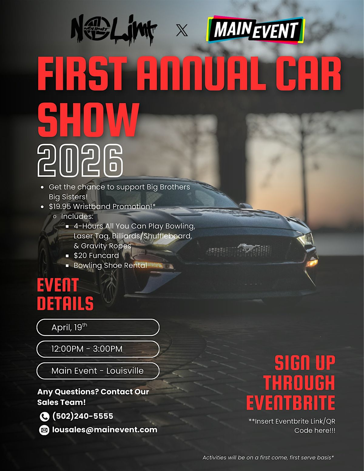 Get ready for the No Limit Car Show hosted by Main Event Louisville supporting The Boys and Girls Club of Louisville! Join us on April 19, 2026 at 12:00 PM for a fun-filled day checking out some amazing rides. Entrance to the car show is free with donations encouraged to support The Boys and Girls Club of Louisville.