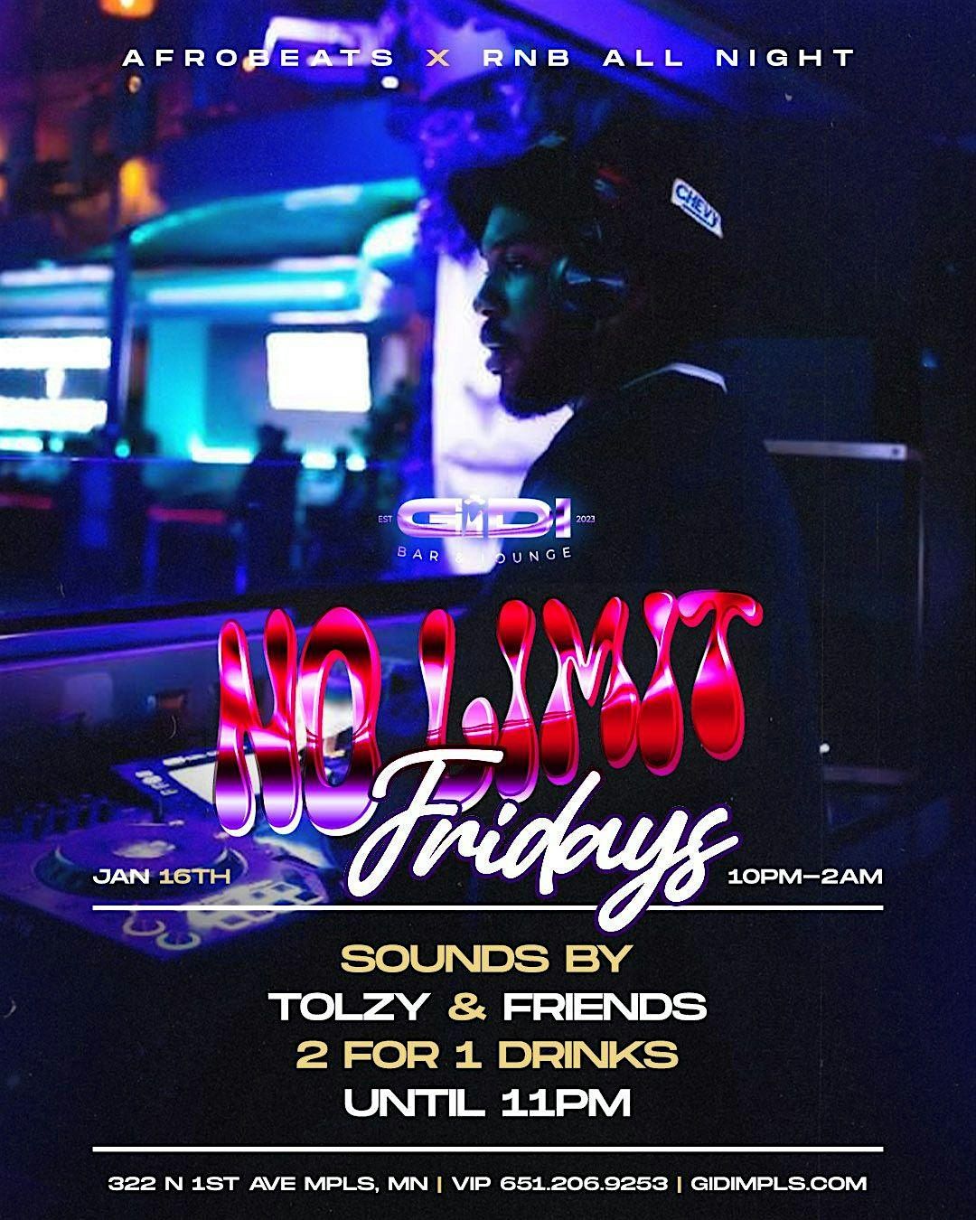 Get ready for No Limit Fridays—where the vibes know no bounds! This Friday, we’re taking you on a musical journey from Afrobeats to R&B to Hip-Hop. Tolzy & Friends are set to ignite the dancefloor, bringing pure and nonstop energy. Don’t miss out on a night of unforgettable moments!