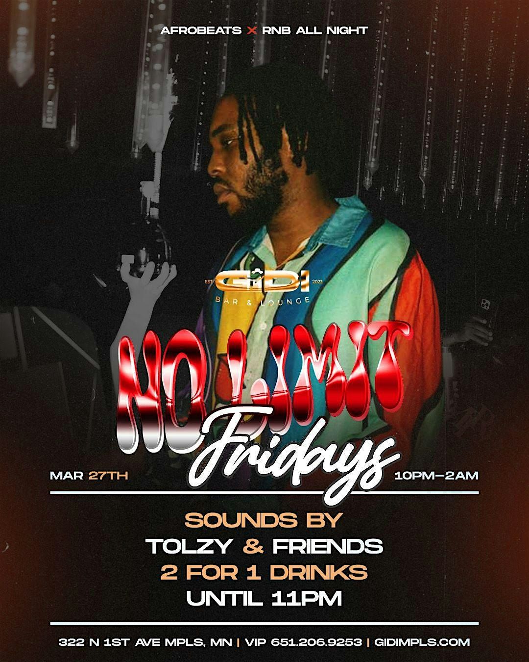 Get ready for No Limit Fridays—where the vibes know no bounds! This Friday, we’re taking you on a musical journey from Afrobeats to R&B to Hip-Hop. Tolzy & Friends are set to ignite the dancefloor, bringing pure and nonstop energy. Don’t miss out on a night of unforgettable moments!