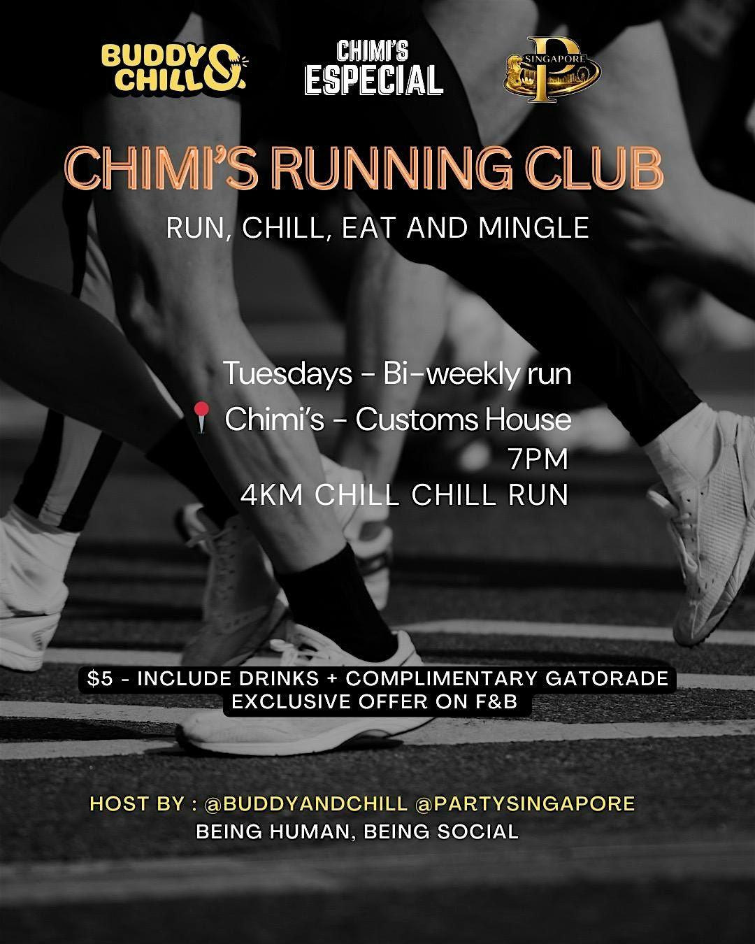 Join us every Tuesday (bi-weekly) at Chimi’s Especial, 7PM, for a social 4KM run designed for both fitness and fun.