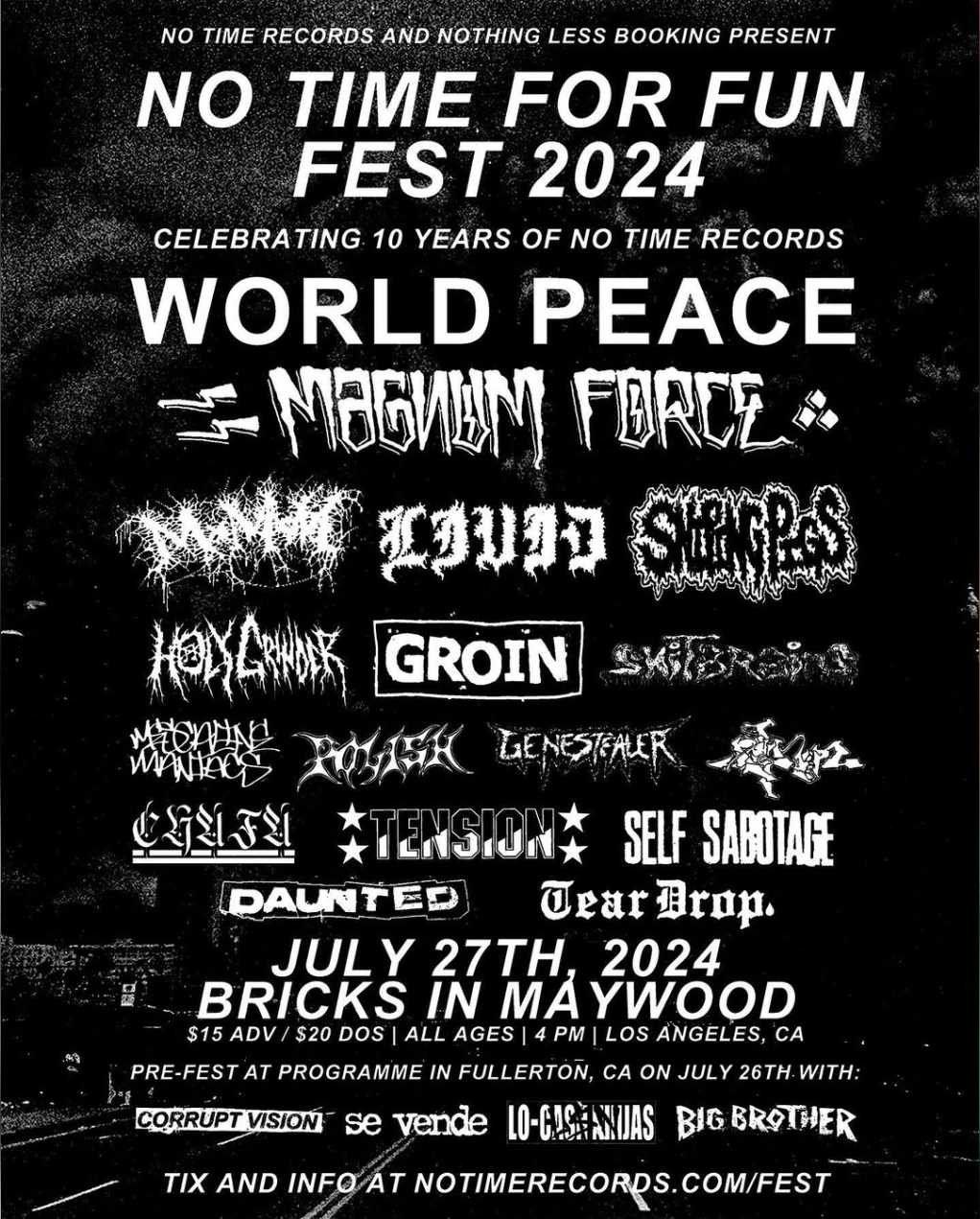 NO TIME FOR FUN FEST 2024 Celebrating 10 Years of No Time Records An evening of grind, power violence, noise and hardcore celebrating a decade of No Time Records! Over a dozen bands + food and merch vendors to celebrate the occasion! feat. WORLD PEACE MAGNUM FORCE MxMxM LIVID SNIPING PIGS HOLY GRINDER GROIN SHITBRAINS CONSEQUENCE POLISH GENESTEALER PRESSER CHAFA TENSION SELF SABOTAGE DAUNTED TEAR DROP All ages VIP TABLES *Includes All General Admission Benefits *6 Tickets - entire party must be present for entry (no more than 6 people to a table) *1x Bottle of Premium Vodka, Tequila, Whiskey, or Champagne. *Cocktail service at your table and mixers will be provided *VIP Priority Admission on a separate VIP line *Must be 21+ *A major credit card and valid photo ID must be presented prior to being seated the night of the event. *Sales Tax on liquor & 20% Gratuity included in the package price. RIDE SHARE RECOMMENDED IF YOU MUST DRIVE, PLAN TO ARRIVE EARLY FOR A SPOT CLOSE TO VENUE - DO NOT LEAVE VALUABLES IN YO?️ Mark your calendar from July 27, 2024 to July 27, 2024 at 1720. No Time for Fun Fest is a celebration of passion, innovation, and community. Embrace the opportunity to explore the world of in a dynamic setting in California, OTHER. Don't miss out on this remarkable event ?. http://maps.seatics.com/GeneralAdmissionEvent_2018-08-31_1222_SVGC_tn.gif
