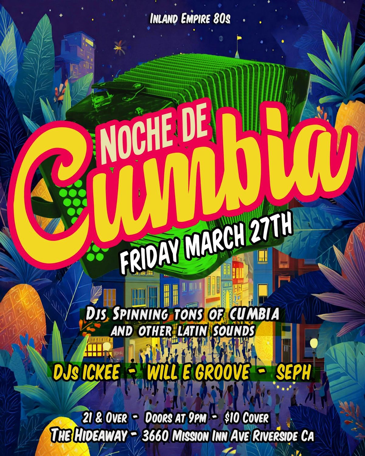 Friday March 27th at The Hideaway in Riverside!Djs spinning tons of Cumbia & other Latin sounds! Djs