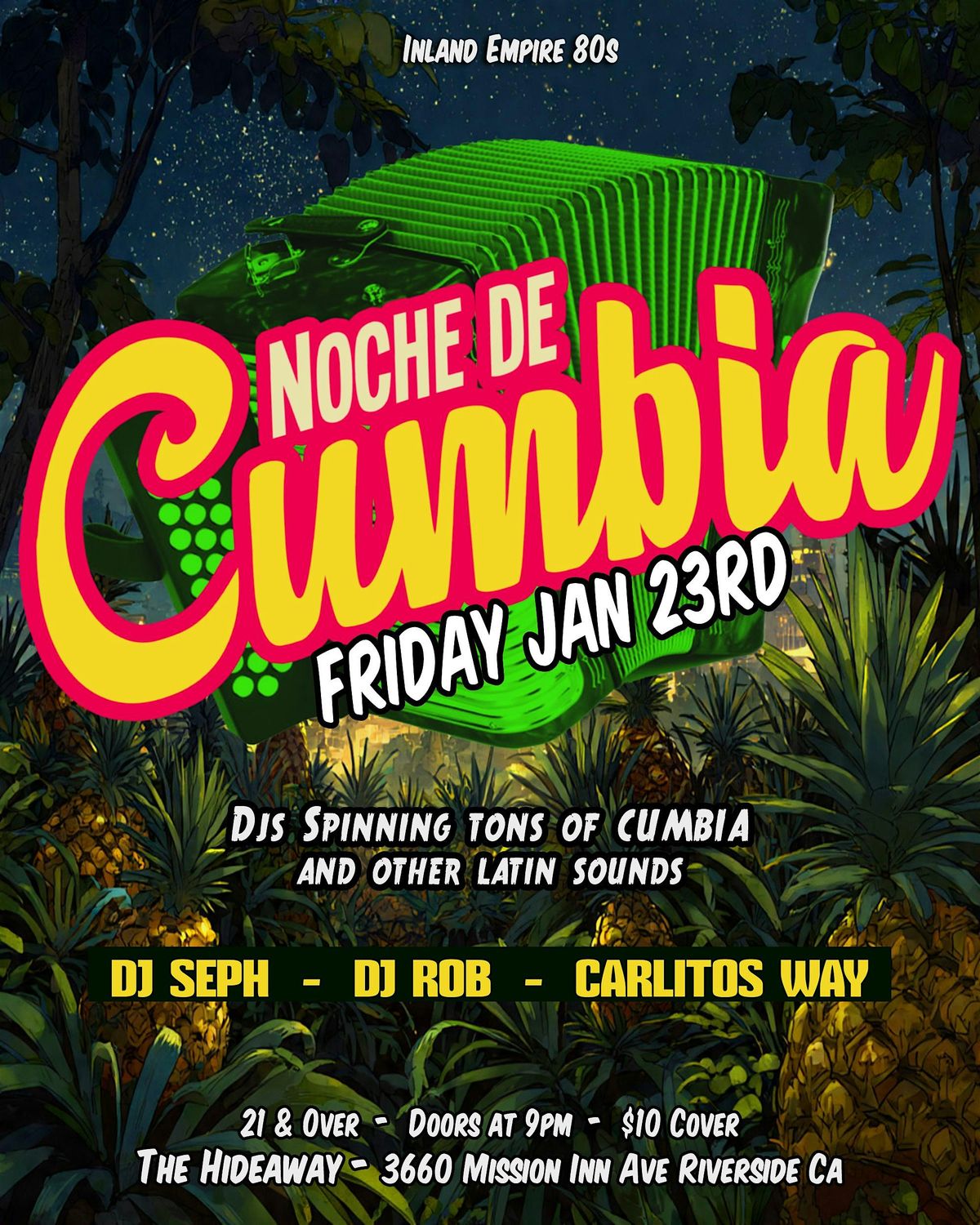 Noche de Cumbia returns Friday Jan 23rd at The Hideaway in Downtown Riverside 🔥
