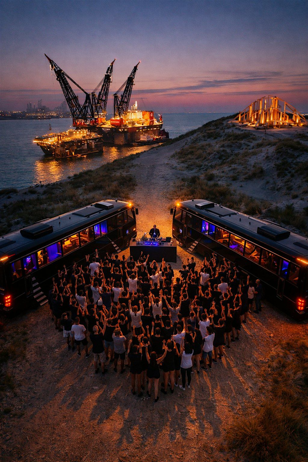 We're making a tour with our open community! 130 beautiful people are stepping into 2 luxurious partybuses. Visiting 2 extraordinary spots outside the city: a art structure in the dunes and a drilling platform. Building our Plug & Play DJ Booth and enjoying one set before getting in the buses again onto the next adventure.