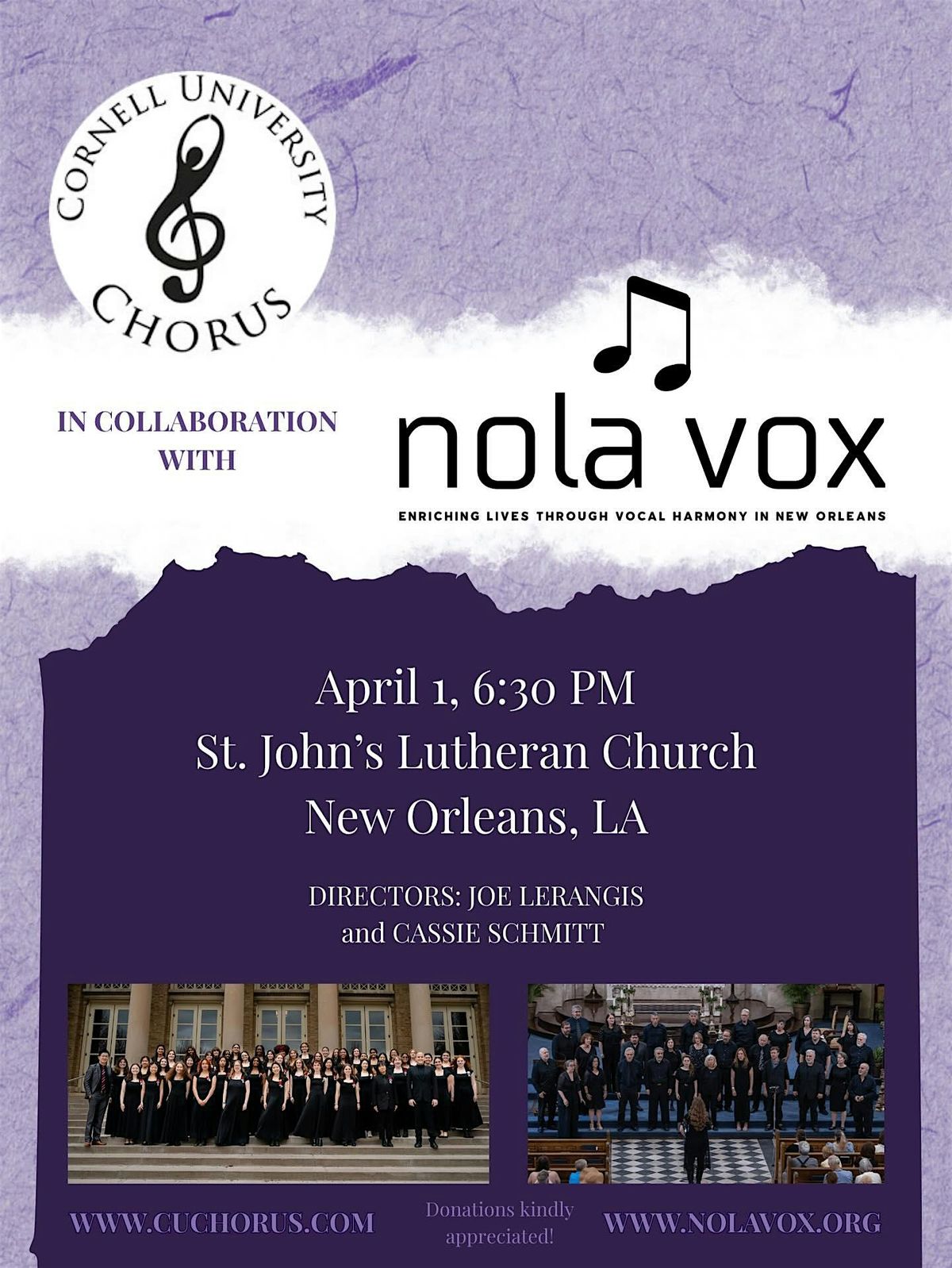Join NOLA Vox for a special evening of vocal harmony as we welcome the Cornell University Chorus to New Orleans as part of their Gulf Coast Tour.