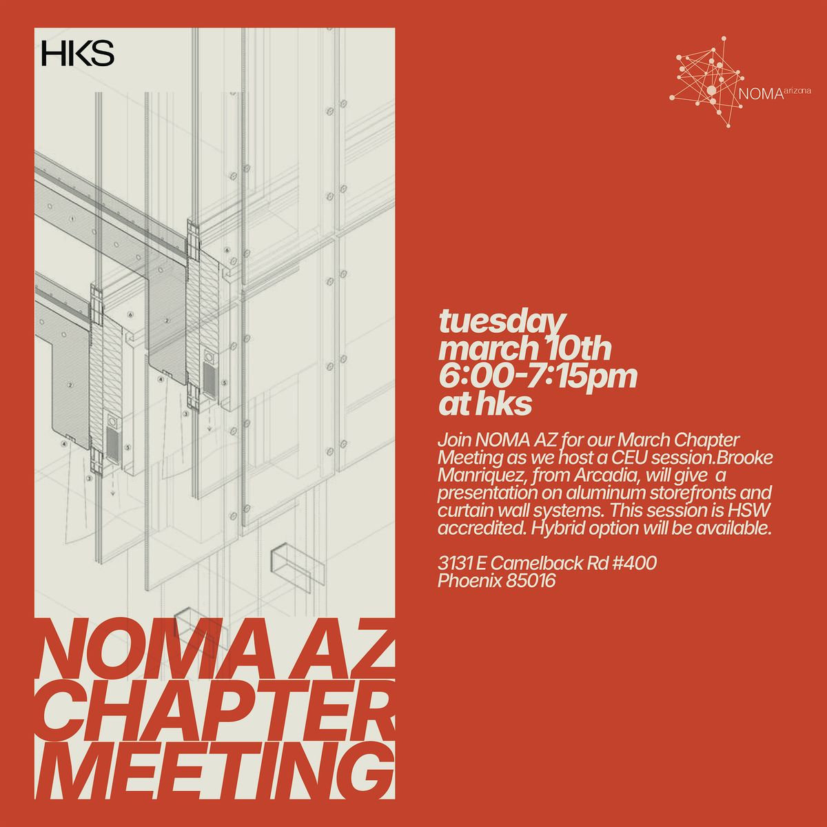 Join us at HKS for of regular chapter meeting. This month, as part of our Professional Development series, we are hosting a CEU session presented by Brooke Manriquez, from Arcadia, featuring aluminum storefront and curtain wall systems. This session is HSW accredited. Mingle with community, build your knowledge, and support your local NOMA chapter!