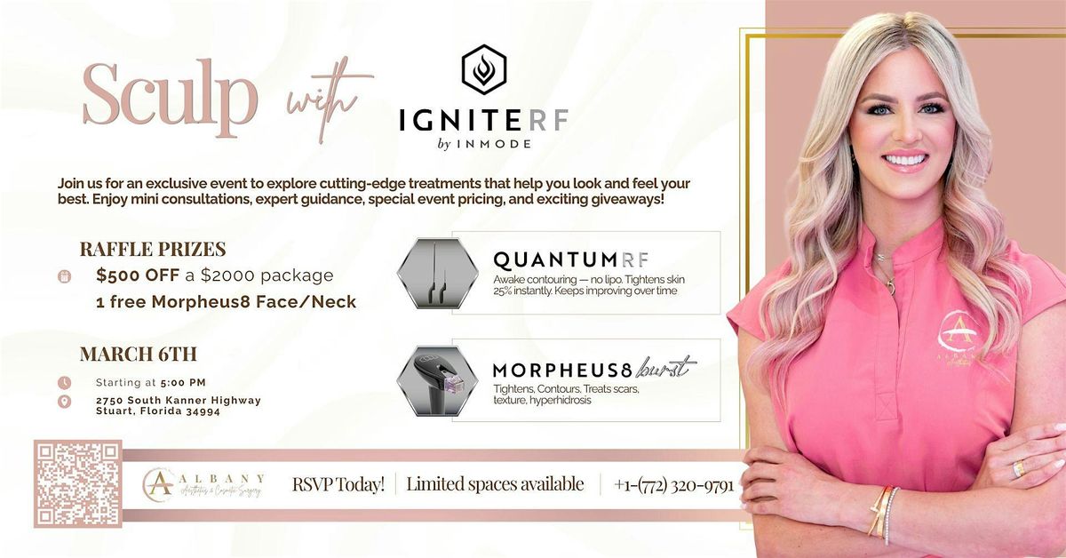 Join us for an exclusive in-office event focused on Non-surgical skin tightening and contouring using the most advanced technologies: QuantumRF and Morpheus8. This event is perfect for anyone noticing skin laxity, crepey texture, or loss of firmness and looking for elective, clinically proven options without surgery. We will be offering Event-only pricing, complimentary consultations, light bites & refreshments, and 2 Raffles with a combined value of $1,700.00! This event will take place at ALBANY AESTHETICS & COSMETIC SURGERY at 2750 S. Kanner HIghway, Stuart 34994. All guests must RSVP by calling 772-320-9791. Limited space available, Guests MUST RSVP! Call now!