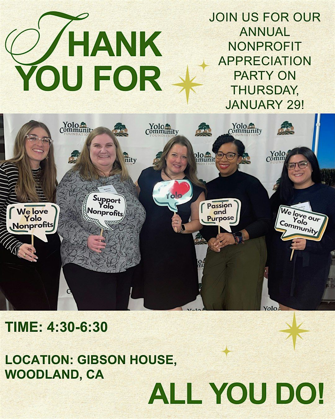 Let's gather to celebrate the spirit of giving, collaboration, and positive change that defines the heart of Yolo County. Your dedication has not gone unnoticed, and this event is our way of expressing our heartfelt appreciation for the time and energy you invest in making our community a better place.
