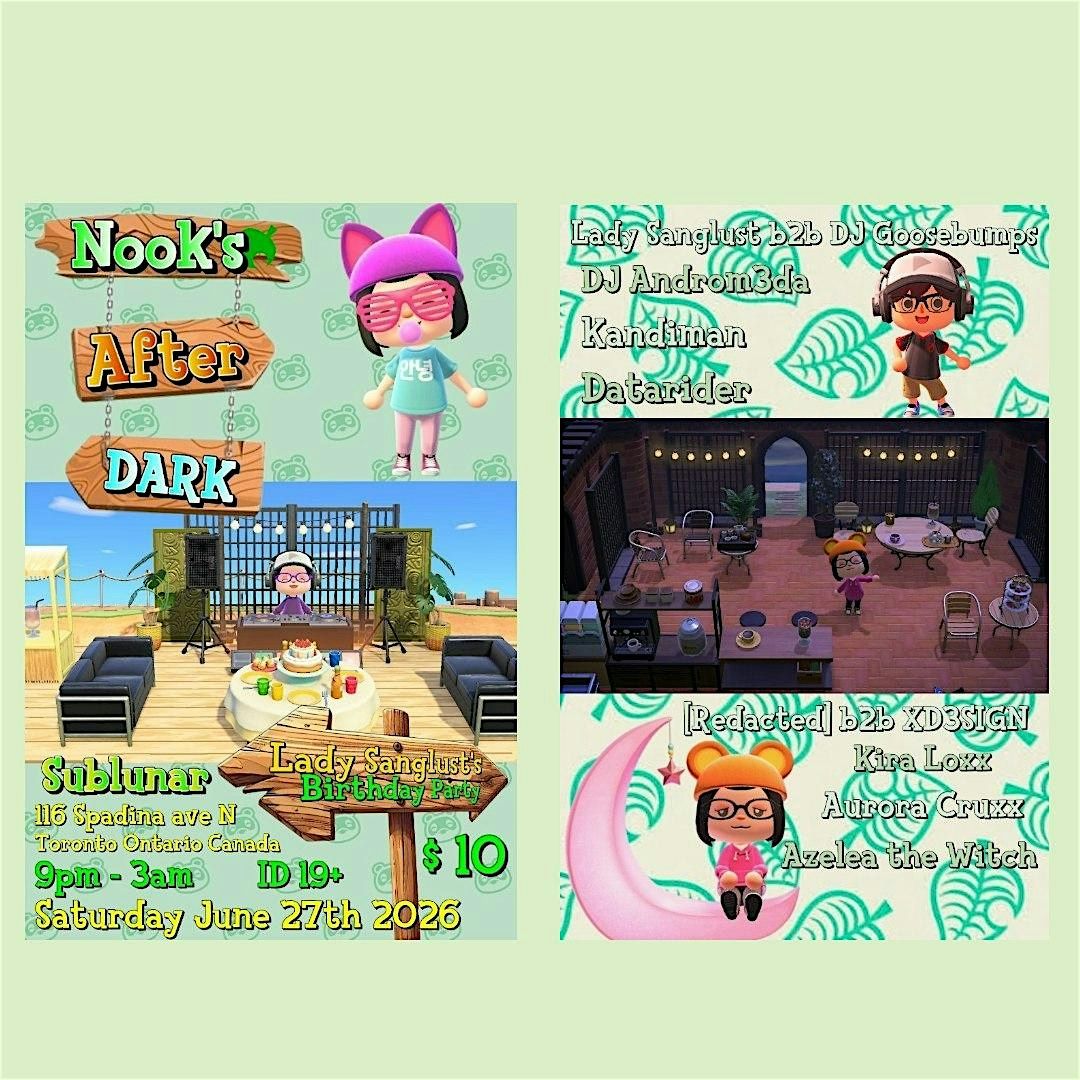 Pack your turnip baskets and catch a ride on Dodo Airlines because Nooks After Dark is taking over Sublunar! Join us on Saturday, June 27th, from 9 PM to 3 AM to celebrate Lady Sanglust’s birthday with an animal crossing-inspired rave full of beats and bells!