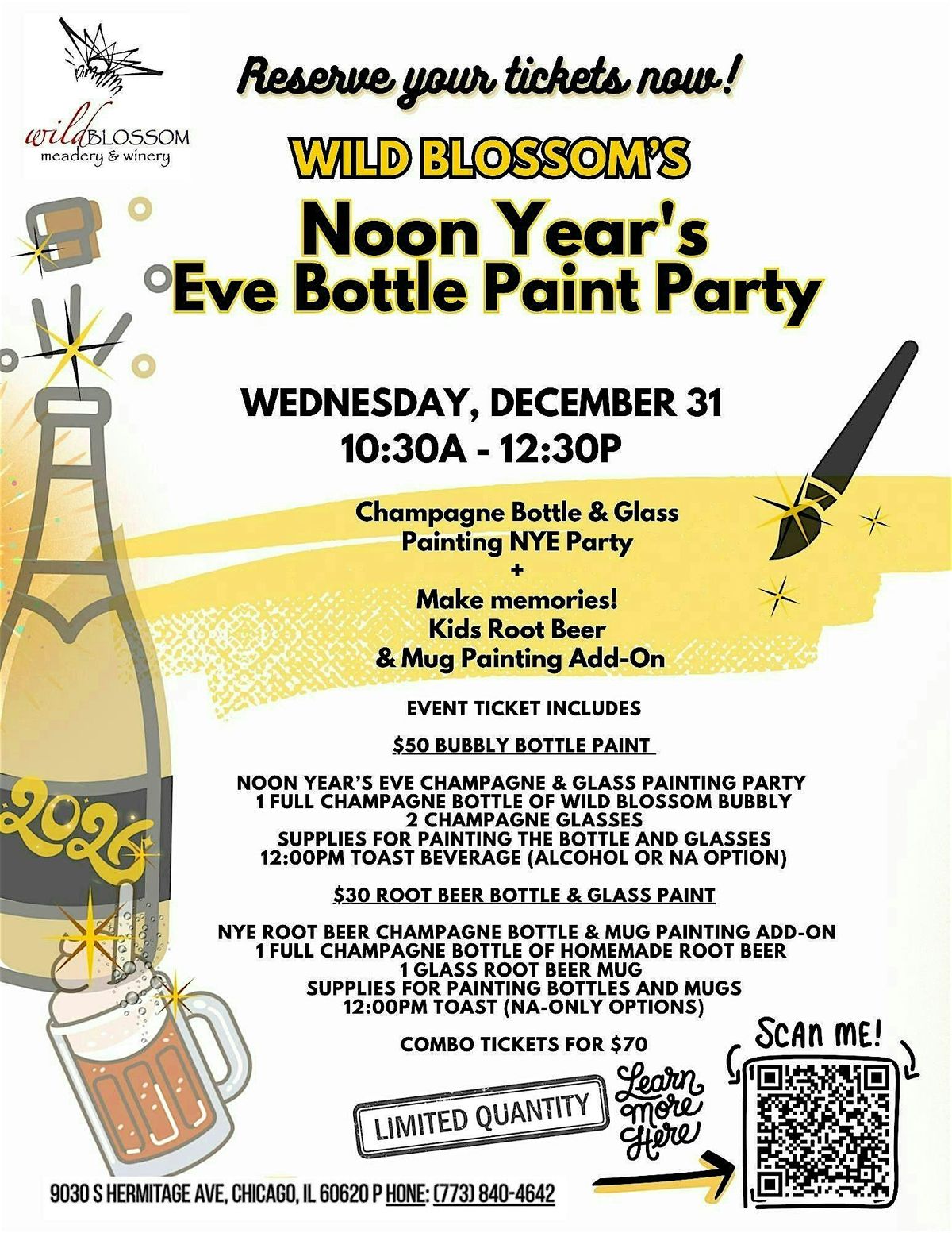 Ring in the NOON YEAR this December 31st and paint your own bottle of bubbly and Champagne glasses. Kids can also get in on the fun with our root beer bottle and mug option as well (parent/guardian must be present). Ticket includes one filled bottle of Wild Blossom Bubbly, 2 Champagne glasses, use of painting supplies, and a drink to toast at the stroke of Noon (Alcohol or NA option). Root beer option includes a Champagne bottle of Root beer, a root beer mug, and a toasting drink as well (NAs-only)