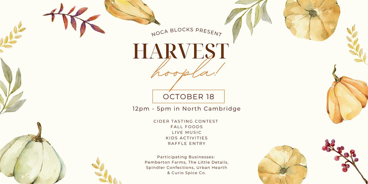 Welcome to the North Cambridge Harvest Hoopla! Join us for a day filled with fun kids activities, a cider tasting contest, delicious food, a raffle entry and local vendors. Get ready to celebrate the harvest season with your friends and family. From pumpkin decorating to live music, there's something for everyone to enjoy. Don't miss out on this exciting event!