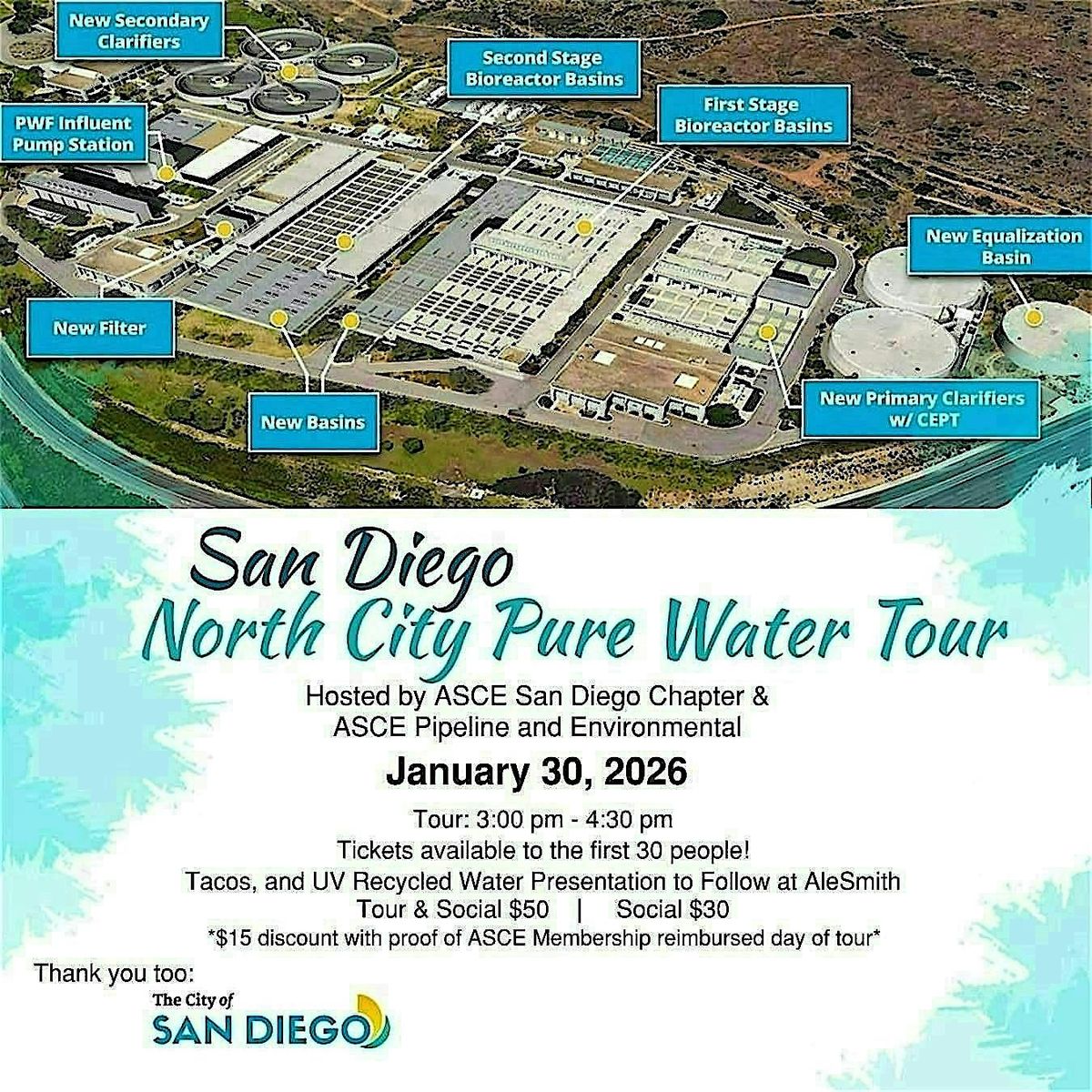 ASCE San Diego Main Chapter, ASCE Pipeline and Environmental, and the City of San Diego have partnered to host the North City Pure Water Tour , followed by a Presentation from Otay Water District Recycled Water UV Disinfection Project at AleSmith.