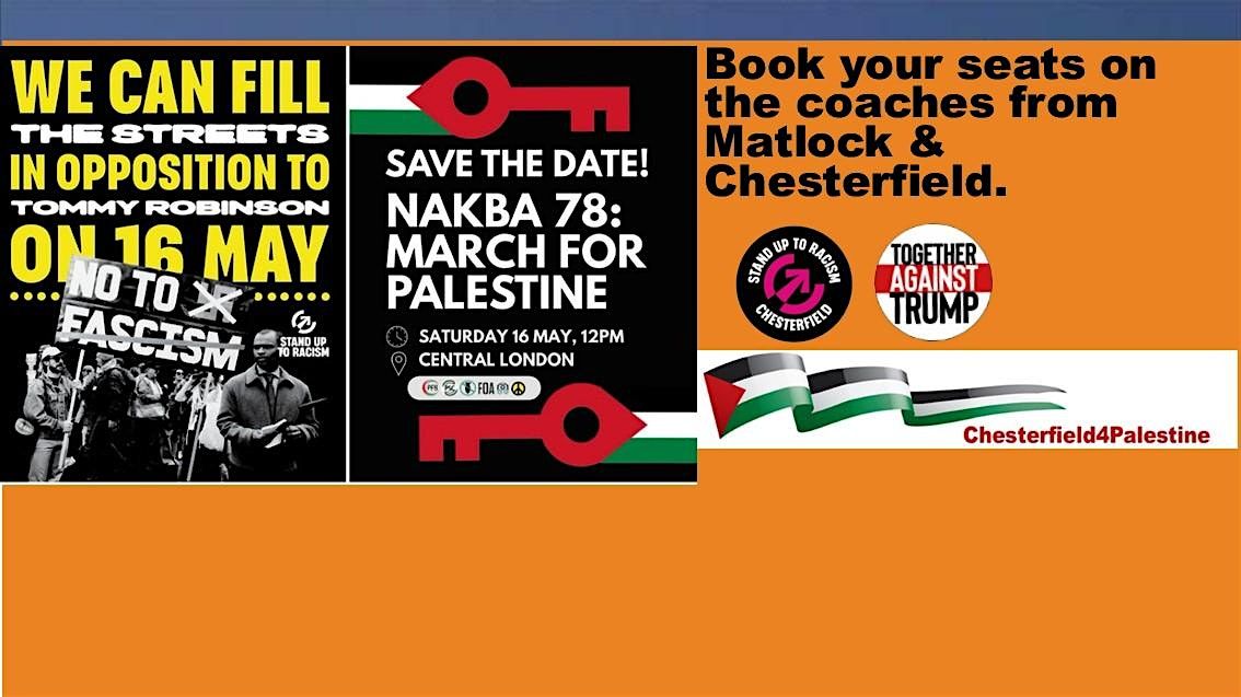 North Derbyshire coach to London Saturday 16 May For Nakba 78 : Oppose Tommy Robison : Unite Against the Far right