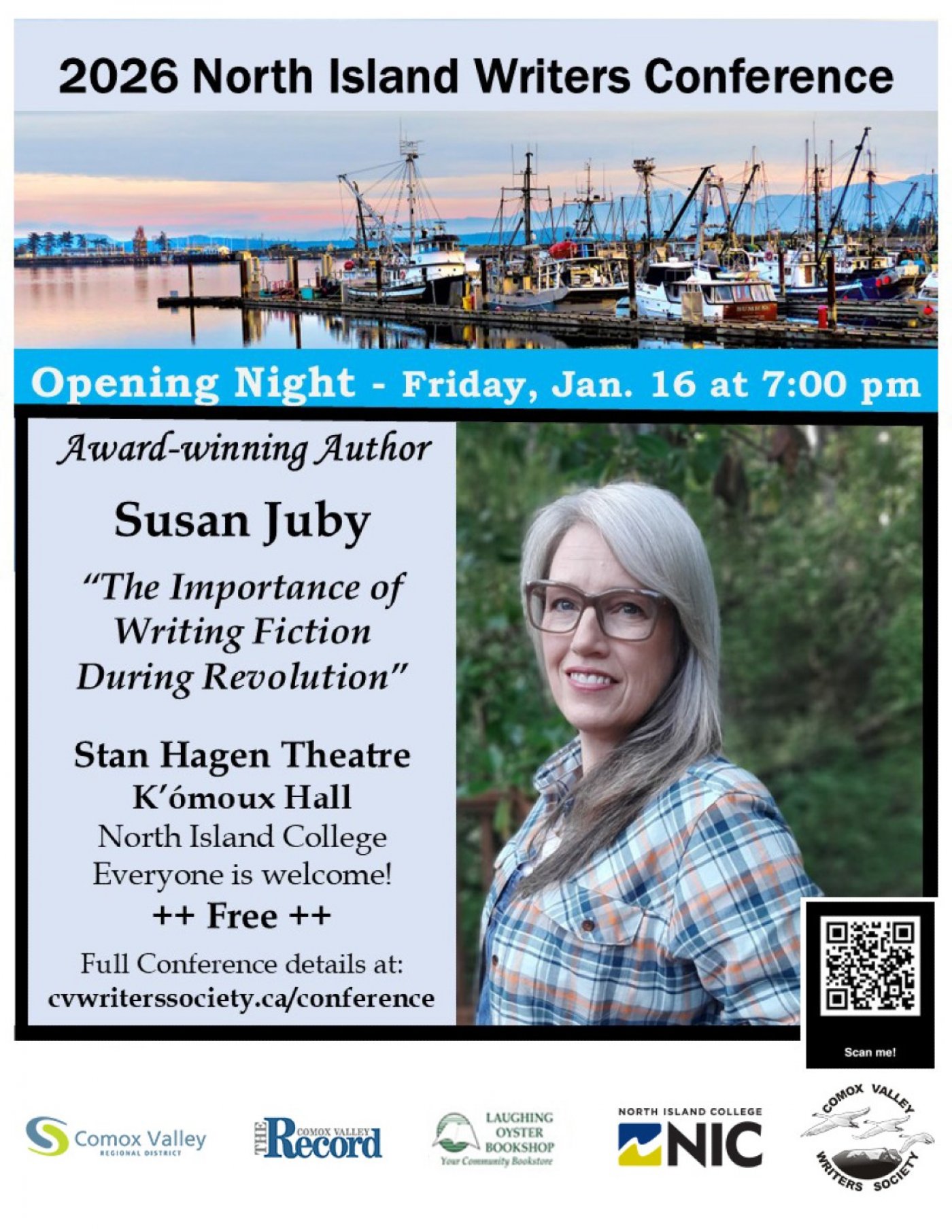Susan Juby, the keynote speaker, is a faculty member at Vancouver Island University and is known for her quirky and comedic characters. Her Friday night presentation, “The Importance of Writing Fiction During Revolution,” will address the impact of AI on creative writing. All are welcome. The event is free, and no registration is required. Join her again on Saturday for her character-building workshop.