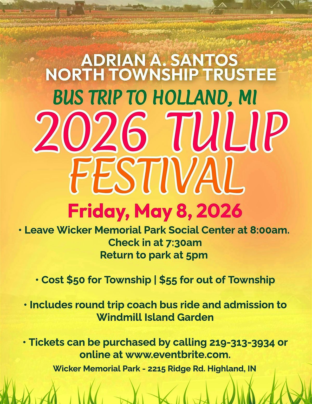 We're off to Holland, Michigan, for the annual tulip festival, and you're invited to join us! We'll be transported to and from the festival on a coach bus, leaving Wicker Memorial Park at 8am. Once we arrive, you can explore the Windmill Island Gardens at your leisure, then go shopping and lunch (on your own) in town. Tickets are $50 for township residents and $55 for non-township. To make your reservations, call 219-313-3934. Don't wait too long to call. Last year, the trip was a sellout, so we don't want you to miss out!