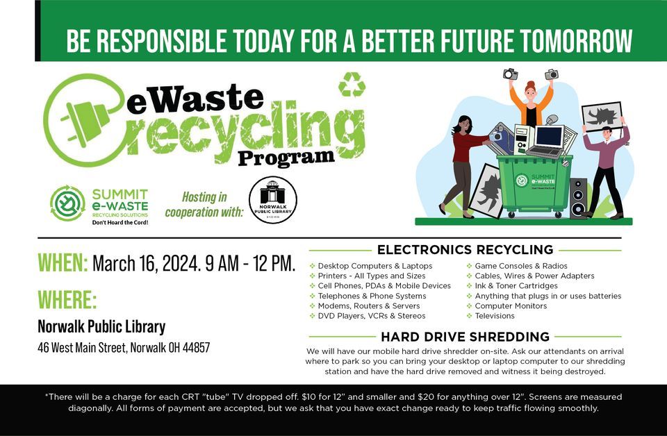 Hello Norwalk! We'll be hosting our first ever electronics recycling event at the Public Library on March 16, 2024, 9 am - 12 pm to collect your old electronics for recycling. See the flyer for details and watch this short explainer video to see how it works. Hope to see you there!