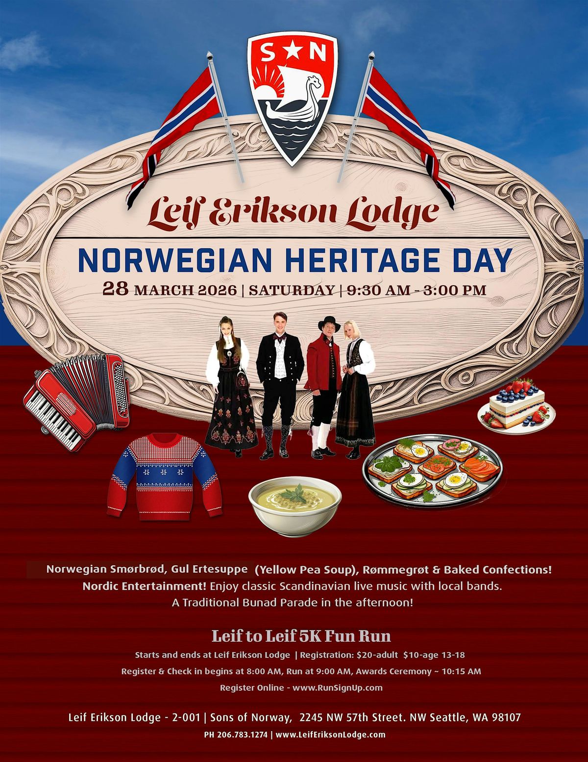 Join us for this year’s Heritage Day/Tastes of Norway at Leif Erikson Lodge, Saturday, March 28, 2026, from 9:30 AM - 3:00 PM.