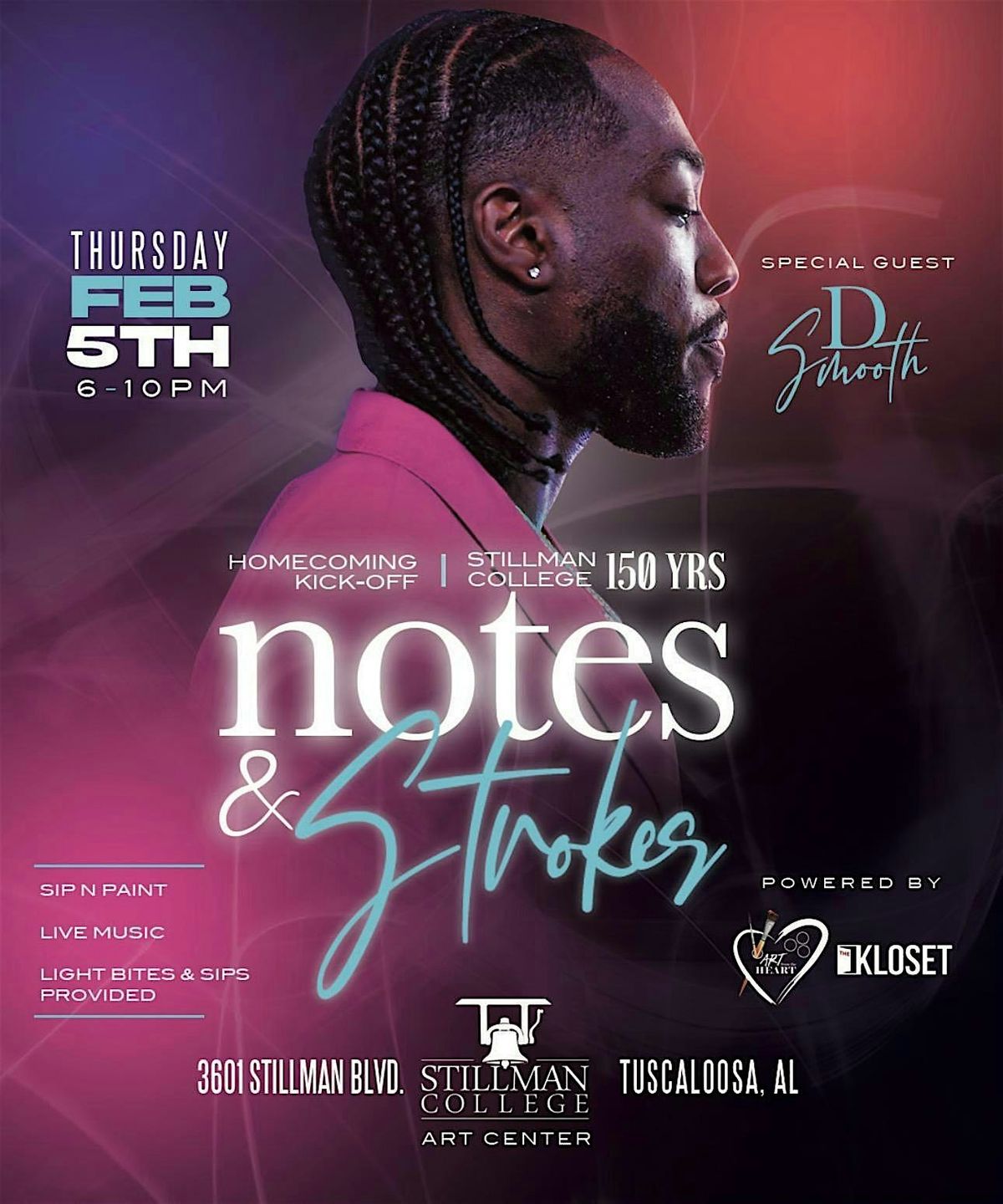 Get ready for a fun, creative, and laid-back experience at our Notes & Strokes event! Join us at Stillman College for an evening filled with good vibes, great music, and guided painting. Whether you’re an experienced artist or just looking for something fun and different to do, this event is perfect for a relaxing night out with friends or a unique date night.