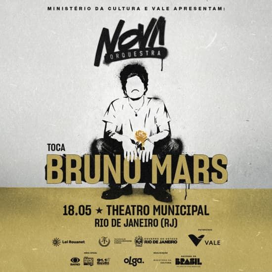 ATENÇÃO! Não será permitido o acesso de espectadores à Sala de Espetáculos após o início da apresentação. Somente será permitido o ingresso de espectadores trajando roupas adequadas, no padrão passeio ou esporte fino, sendo terminantemente vedada a entrada de pessoas com vestimentas consideradas inadequadas, tais como: top (cropped), shorts, minissaias e vestidos acima da altura do joelho, bem como o uso de chinelos, exceto para crianças de até 10 anos Ingressos para Nova Orquestra toca Bruno Mars, no Theatro Municipal do Rio de Janeiro 🎫 Plateia/Balcão (escolha durante a compra) Inteira Meia-entrada O que você vai curtir ■ Grandes sucessos de Bruno Mars reinterpretados em arranjos orquestrais inéditos, criados especialmente para o espetáculo. ■ Experiência única que mistura orquestra e banda pop, aproximando o público da música de concerto por meio de grandes sucessos de Bruno Mars, como Just the Way You Are, Grenade, Talking to the Moon, Locked Out of Heaven, Treasure, 24K Magic e Uptown Funk, em novas versões que ampliam a dimensão sonora desses hits que marcaram diferentes gerações. ■ Espetáculo ao vivo da Nova Orquestra, primeira orquestra 100% pop do Brasil, projeto que já impactou mais de 1 milhão de pessoas em concertos e que chega pela primeira vez ao palco do Theatro Municipal do Rio de Janeiro, marco importante em sua trajetória. ■ Estratégia robusta de comunicação e divulgação, com investimento em produção de conteúdos profissionais, assessoria de imprensa, divulgação digital e presença em rádios, jornais e mídias tradicionais, além de uma narrativa progressiva nas redes sociais apoiada por mídia paga para ampliar alcance, gerar visibilidade, engajamento e conversão de público. Informação 📅 Segunda-Feira 18 de Maio de 2026 - Início às 19h - Abertura das Portas 18h. ⏳ Duração: 1h30 minutos 📍 Local: Theatro Municipal do Rio de Janeiro 👤 Idade: livre para todas as idades ♿ Acessibilidade: local acessível para cadeirantes ❓ Você pode consultar as perguntas frequentes (FAQs) deste evento aqui 👉 Consulte todos os detalhes sobre a meia-entrada aqui Descrição A Nova Orquestra apresenta um espetáculo inédito dedicado a Bruno Mars, um dos maiores nomes da música pop mundial. Primeira orquestra 100% pop do Brasil, a Nova transforma os maiores sucessos do artista em versões orquestrais inéditas, criando uma experiência que une a força da música de concerto à energia do pop contemporâneo. O espetáculo percorre diferentes fases da carreira de Bruno Mars, trazendo ao palco novas interpretações de canções que marcaram gerações. Com formação que combina cordas, sopros e banda pop, o concerto cria uma atmosfera dinâmica que alterna momentos emocionantes e explosões de energia. Mais do que um tributo, o espetáculo propõe uma experiência musical imersiva que aproxima novos públicos da música orquestral por meio de repertórios conhecidos e profundamente populares.