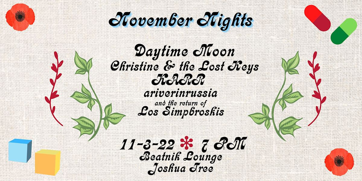 An enchanting evening of music featuring Daytime Moon, KARR, Christine and the Lost Keys, ariverinrussia, and the return of Los Simpbroskis! Come and celebrate in the autumn night, hear wonderful music and mingle under the stars! Located at the world famous historical Beatnik Lounge, the coolest vortex in the mojave desert, this particular event falls on Neil Young's birthday and just a few days away from Gram Parson's birthday as well! Feel the rhythm and taste the vibes! This festival of lights will be one you will never forget! ALL AGES! Please don't touch the art. Respect the space, bring a friend!