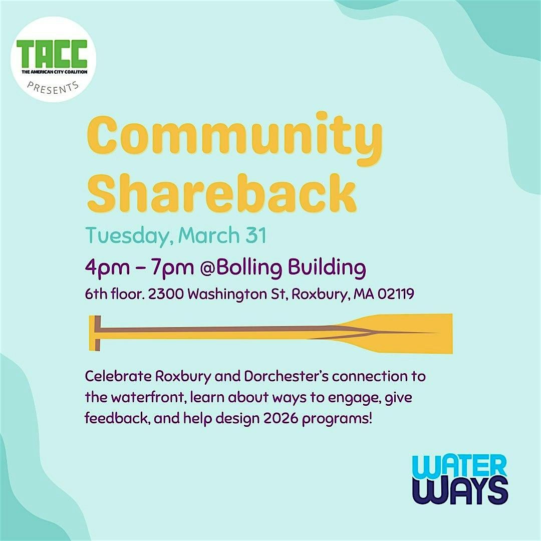 What is the Community Shareback?|¿Qué es el Intercambio Comunitario?: It is an opportunity to reflect on our Waterways initiative, and to learn from YOU on how we can improve it. It is also a time to have fun, learn about ways to benefit from the water, and be in community with each other. | Es una oportunidad para reflexionar sobre nuestra iniciativa de Vías Navegables y para aprender de USTEDES en cómo podriamos mejorarla. También es un momento para divertirnos, aprender sobre los beneficios del agua y estar en comunidad: