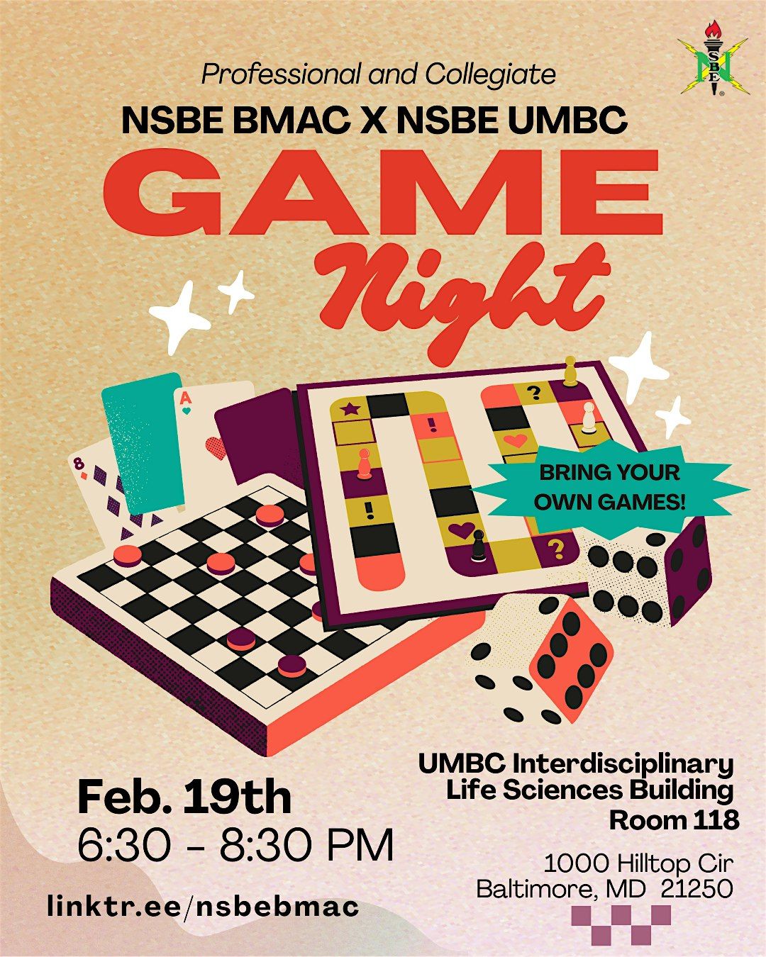 Join us for an awesome in-person night of games, laughs, and networking at the NSBE Collegiate x Professional Game Night hosted by the NSBE University of Maryland Baltimore County chapter! Itβs the perfect chance to chill, meet new people, and have a blast with fellow NSBE members from both collegiate and professional chapters. Whether youβre into board games, card games, or just good vibes, this night is for you. Donβt miss out!