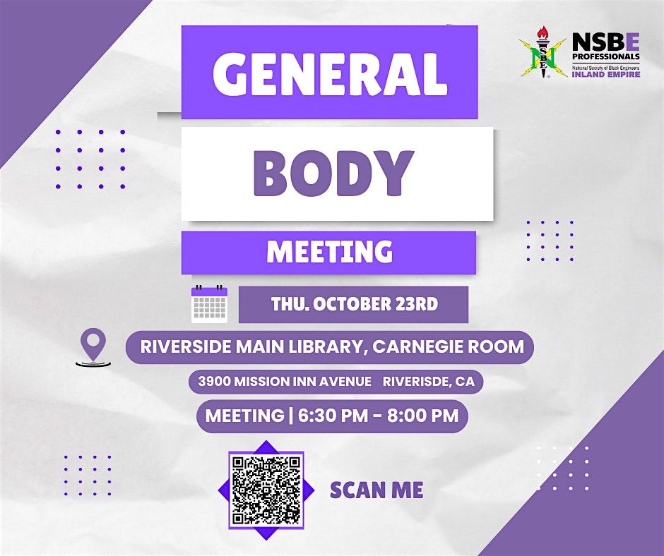 Join us for the upcoming NSBE IE Professionals General Body Meeting at Riverside Main Library - Carnegie Room. We will also be hosting the meetin on microsoft teams!