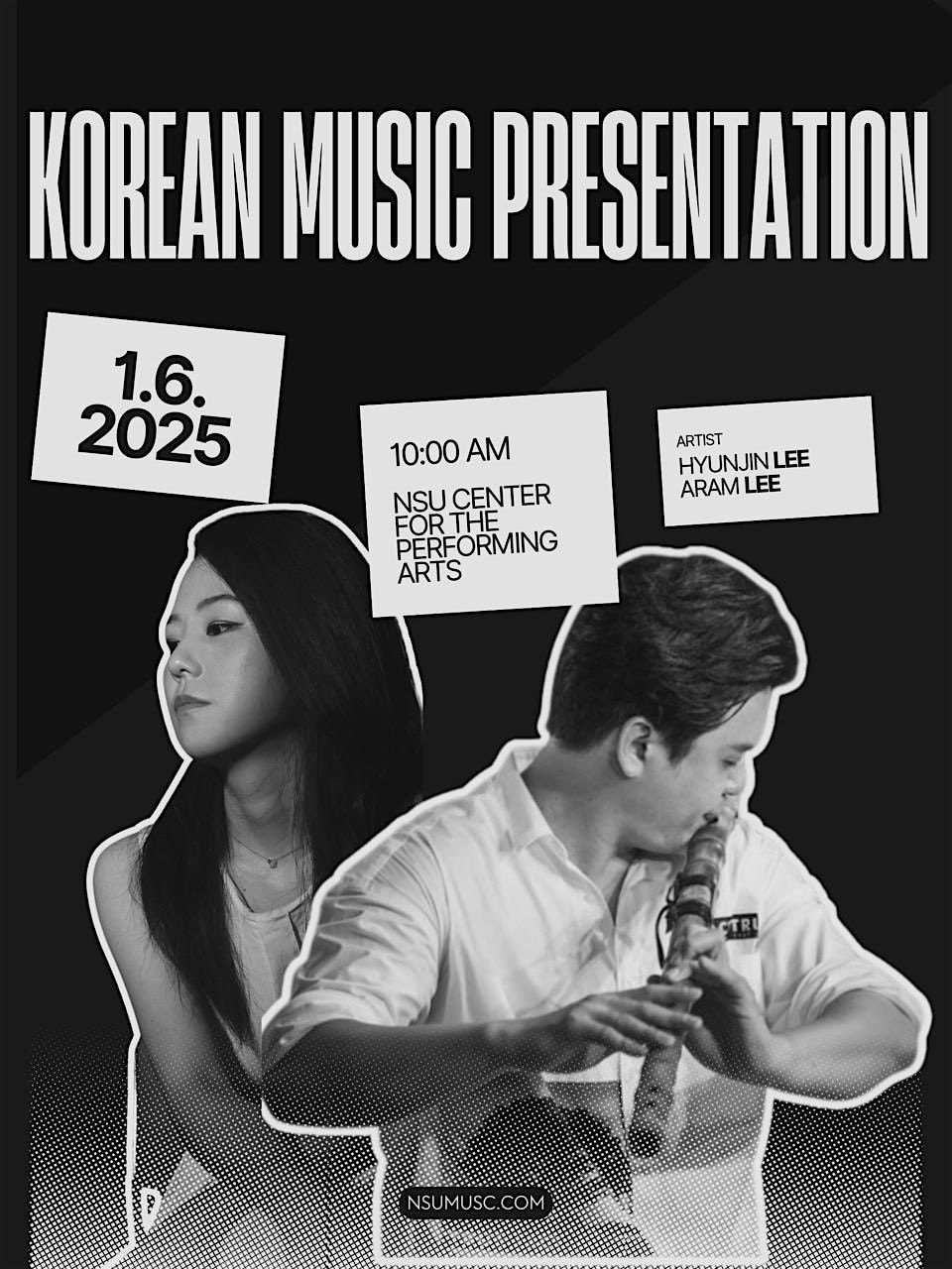 Join NSU Music and guest artists Hyunjin Lee and Aram Lee for a presentation of traditional Korean music and instruments.About this Event