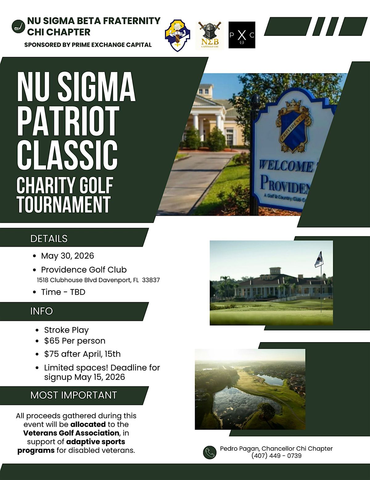 Join the Nu Sigma Beta Fraternity and its Chi Chapter for the inaugural Nu Sigma Patriot Classic, a charity golf tournament dedicated to supporting those who served. Sponsored by Prime Exchange Capital, this event brings together the community for a day of competitive play and philanthropy at the beautiful Providence Golf Club.