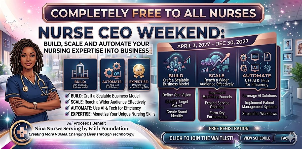 The Nurse CEO Weekend is a free, professional incubator designed to bridge the gap between clinical nursing and digital entrepreneurship by teaching you to Build, Scale, and Automate your medical expertise into a profitable business. Hosted by the Nina Nurses Serving by Faith Foundation, this comprehensive series guides participants through identifying high-value niches like legal consulting or health coaching, implementing advanced marketing funnels for global growth, and integrating cutting-edge AI tools to ensure your business operations run efficiently on autopilot. This is your definitive roadmap to transitioning from the bedside to the boardroom, empowering you to monetize your unique skills and reclaim your time through modern technology and strategic business systems.