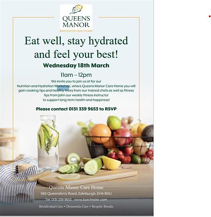You’re invited to our nutrition and hydration workshop.Queens Manor care home is inviting you to join us for a community event on nutrition