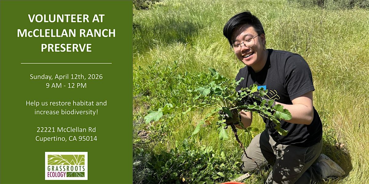 Join Grassroots Ecology in our ongoing restoration of habitat in the meadow at McClellan Ranch Preserve in Cupertino! We will spend our time together weeding invasive plants like thistle and mustard. Volunteers should expect to walk off trail on uneven ground, kneel or sit on kneeling pads, use hand tools and body tools, and carry buckets.