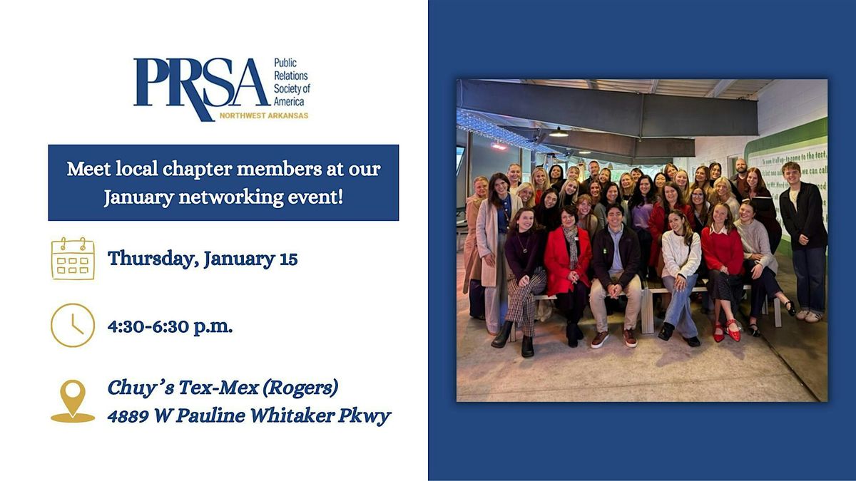 Come join NWA PRSA for an evening of networking and professional connection with communicators across Northwest Arkansas.This is a relaxed, come-as-you-are meet-up designed for PR, marketing, corporate communications, agency, nonprofit, and in-house professionals who want to build relationships that actually lead to collaboration, referrals, and new opportunities. Whether you’re new to the area, growing your career, or simply looking for peers who understand the work, you’ll leave with new connections and fresh perspective.Why NWA PRSA: NWA PRSA is more than a professional organization, it’s a local community of communications pros who support one another through learning, sharing, and real-world connection.
