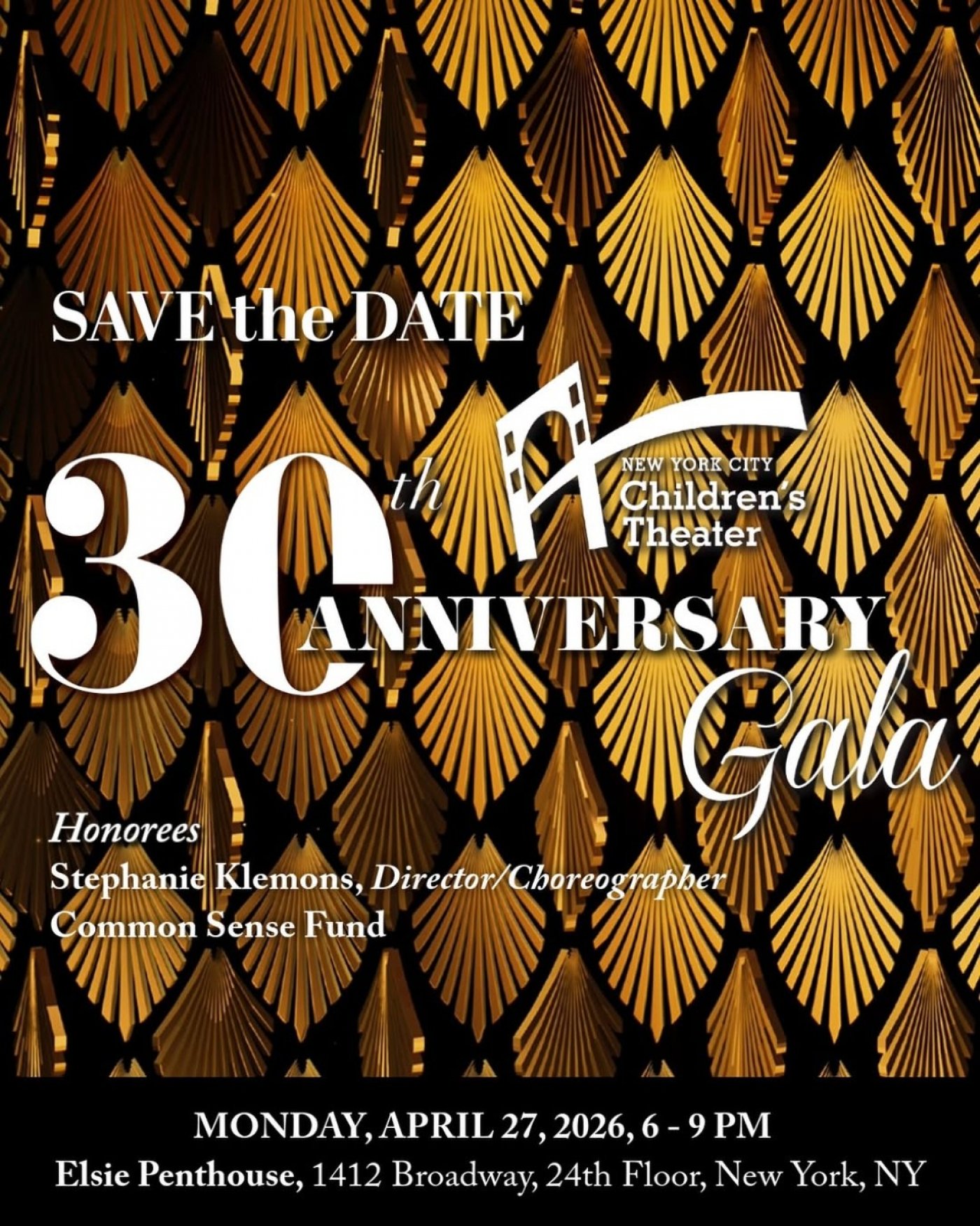 New York City Children's Theater (NYCCT) will present its 2026 gala honoring its 30th anniversary on Monday, April 27th, at Elsie Rooftop, 1412 Broadway, NYC. It will be hosted by Emmy award-winning ABC7 anchor, Sandra Bookman, with a special video presentation by award-winning actor, composer, lyricist, playwright, and filmmaker Lin-Manuel Miranda, and features live musical entertainment by Anika Larsen, Storm Lever, Eryn LeCroy, and more to come!
