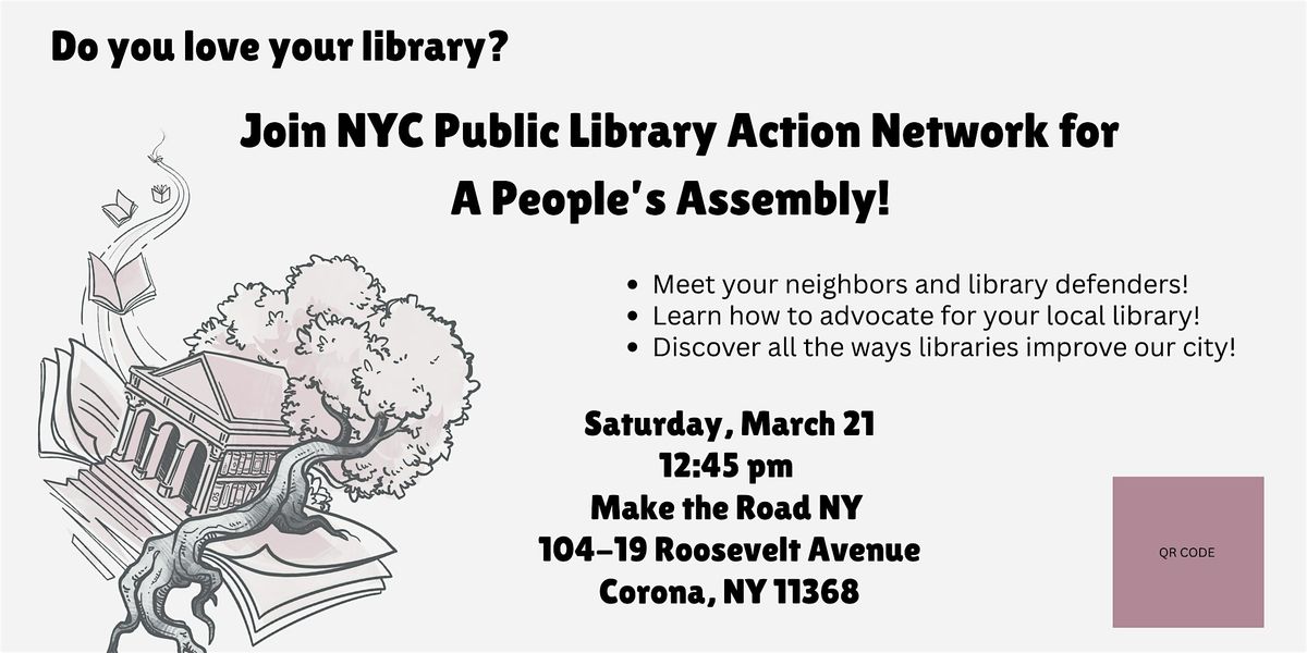 NYC Public Library Action Network (NYC PLAN, Red de Acción de la Biblioteca Pública de Nueva York) los invita a nuestra tercera asamblea popular. La asamblea popular es una reunión con moderadores donde los miembros de la comunidad conversan sobre temas importantes, y juntos deciden cómo abordar y resolver problemas.