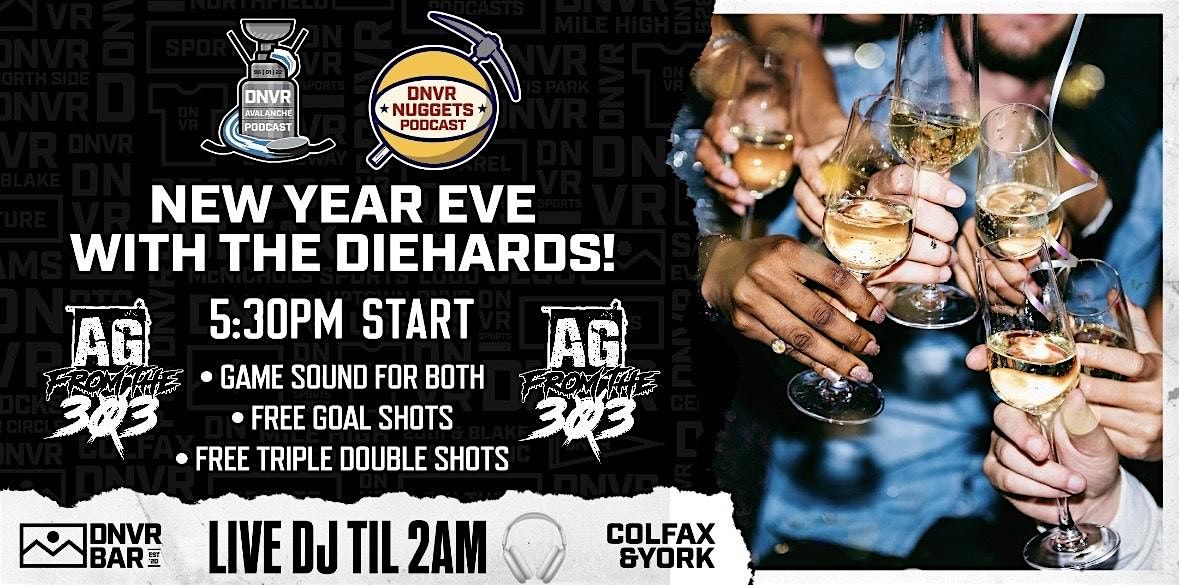 Get ready to ring in the New Year with great vibes and awesome company! Join us in person for a night filled with intense Nuggets and Avs action on the big screen. Feel the energy as our live DJ - AG From the 303 - spins tunes to keep the party going. FREE Avs goal shots and if any Nuggets get a triple double! Doors open til 2AM!