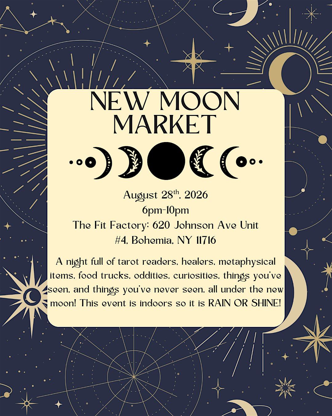 A night full of tarot readers, healers, metaphysical items, food trucks, oddities, curiosities, things you've seen, and things you've never seen, all under the new moon! This event is indoors so it is RAIN OR SHINE!