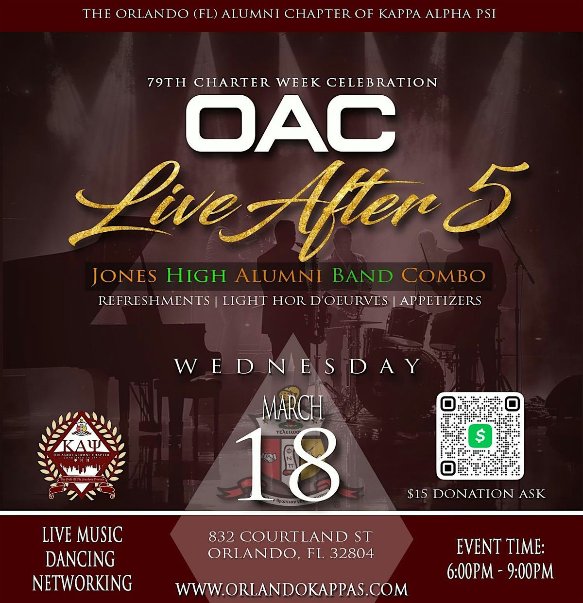 Welcome to OAC Live after 5! Join us at the Orlando Alumni Administration Building on March 18, 2026 at 6:00 PM (Eastern Time) for an evening of fun and networking. This event is the perfect opportunity to connect with fellow alumni and make new friends. Don't miss out on this chance to reminisce about old times and create new memories. We can't wait to see you there!