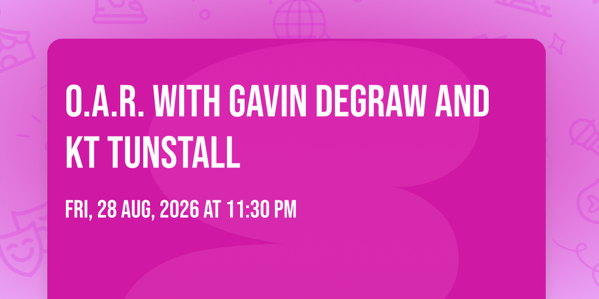 π Location: 35.8144, -86.8373π Welcome to O.A.R. with Gavin DeGraw and KT Tunstall, where the impossible becomes possible and dreams take flight! ποΈ Join us at FirstBank Amphitheater in the heart of Franklin, TN for an event that will redefine your expectations. π On August 28th, 2026 at 11:30 PM, witness the transformation of space and time into something truly magical. β¨ It's a curated experience combining the best of innovation, entertainment, and community spirit, creating moments that will be remembered for years to come. Whether you're a first-time visitor or a seasoned enthusiast, prepare to be amazed. π Book now to ensure your place in this unforgettable experience!