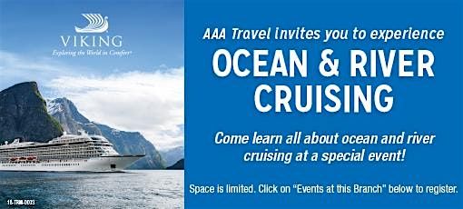 AAA Travel invites you to experience ocean & river cruising. Please join us for an exciting presentation with AAA and Viking Ocean and River Cruises and embark on a journey to remember. With an itinerary collection featuring breathtaking cities in Europe, Asia & other exciting destinations; a Viking Ocean or River Cruise is truly unique. And with the exclusive benefits you will receive for traveling with AAA, it will be a vacation like no other. Enjoy the special experiences, personalized service and exceptional value that only come when you book through AAA Travel. Call today to reserve your seat for this presentation!