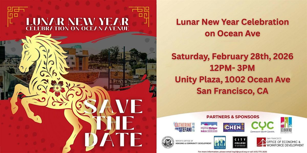 The Lunar New Year Celebration on Ocean Avenue welcomes the Year of the Horse on Saturday, February 28, 2026, from 12 pm to 3 pm at Unity Plaza (1002 Ocean Avenue). This family-friendly event will feature cultural performances, interactive games, arts and crafts, a resource fair, and local vendors. The first 400 attendees will receive a free lunch box.