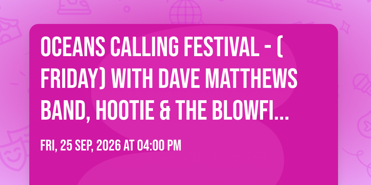 ๐ Location: 38.3265, -75.0863๐ Welcome to Oceans Calling Festival - (Friday) with Dave Matthews Band, Hootie & The Blowfish, and more!, where dreams come alive and possibilities are endless! ๐๏ธ Join us at Ocean City Inlet in the heart of Ocean City, MD for an event that defies expectations. ๐ On September 25th, 2026 at 04:00 PM, be part of something truly extraordinary as we bring together innovation, entertainment, and pure magic. โจ Every aspect has been carefully designed to ensure an unforgettable experience for all our guests. Whether you're seeking adventure, inspiration, or simply a break from the ordinary, this event promises to deliver beyond your wildest dreams. ๐ Prepare for a journey into the extraordinary!